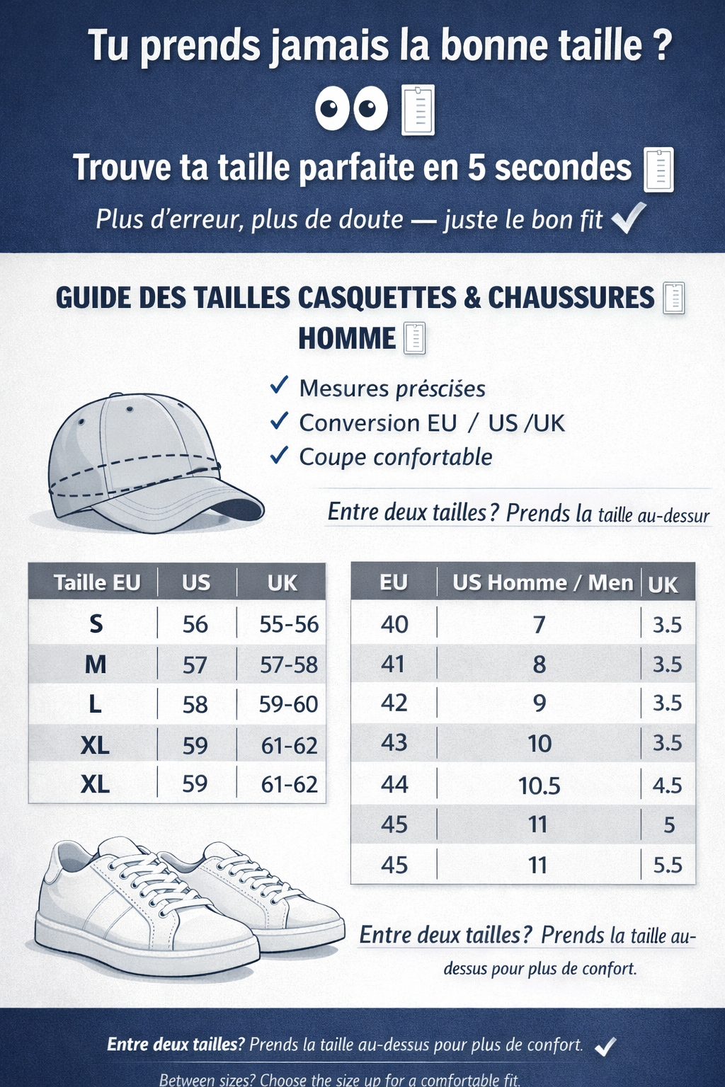 Casquette + baskets = sizing parfait đŻ Fini les erreurs â prends la bonne taille du premier coup âïž